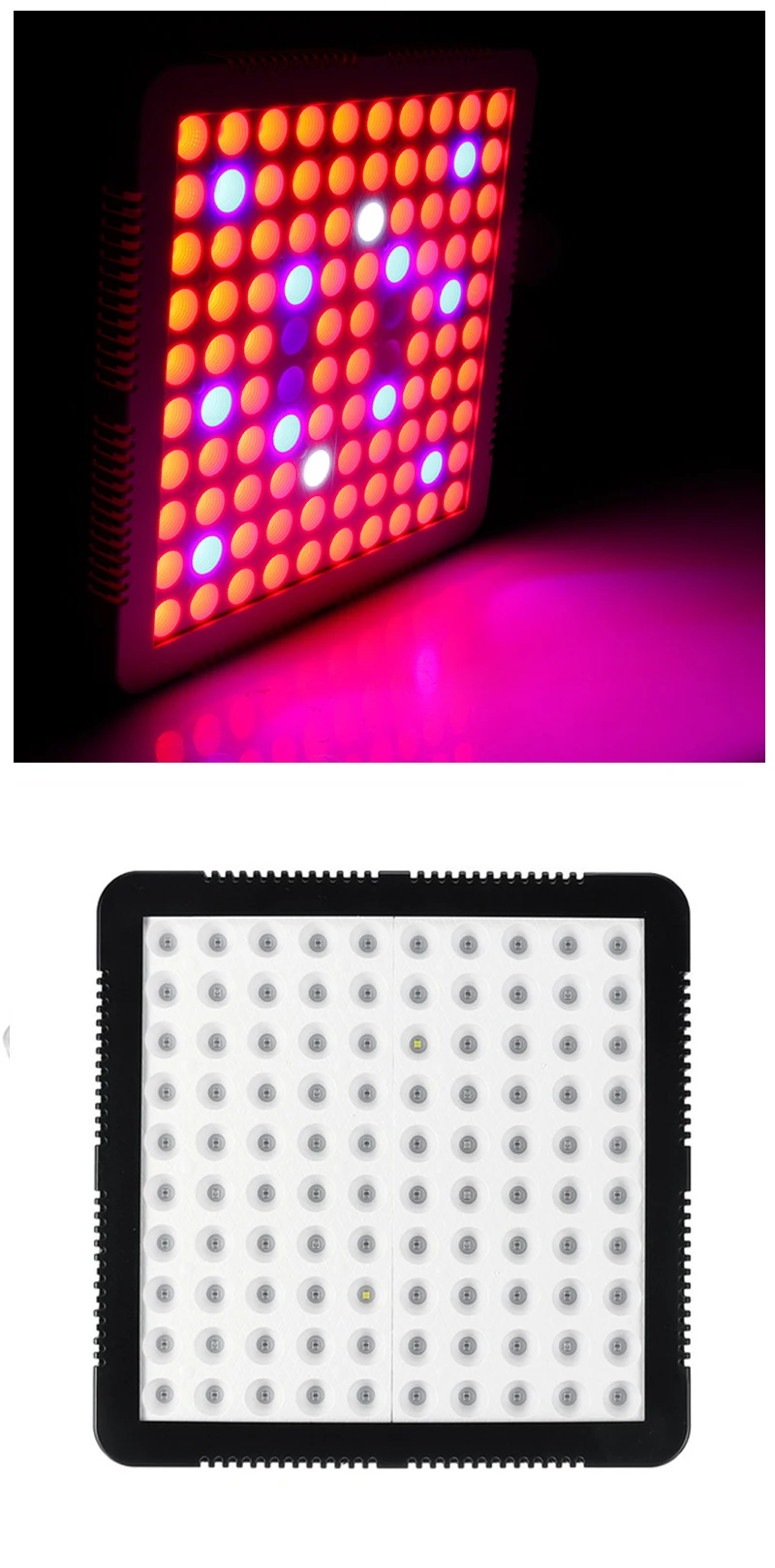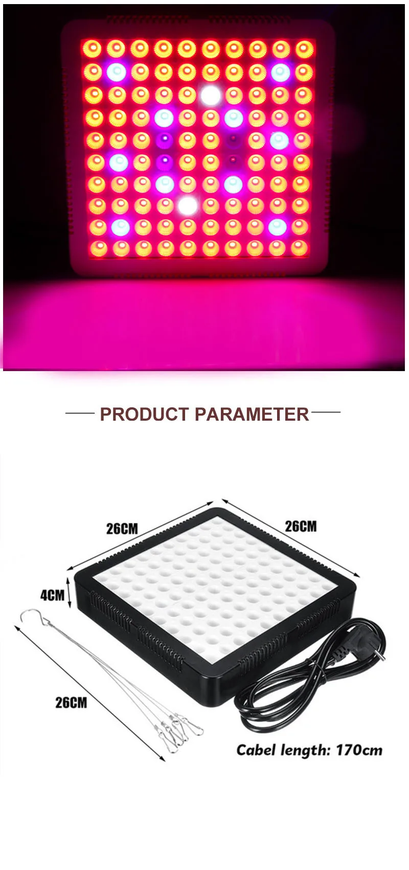 Brand NamegreensindoorModel NumberGrowth lampMaterialAluminumItem TypeGrow LightsWidth26cmPower SourceACLength26Voltage85-265VFeaturesFull spectrumCertificationCCCCertificationceCertificationFCCCertificationROHSBody MaterialAluminumLight SourceLED BulbsWarranty3 YearIs DimmableNoMeasurement unit100000015Each pack1Product nameLamp for plantsProduct numberC39998Product colorBlackProduct size26*26*4cmLed quantity100leds(Red+blue+white+UV+IR)Product functionBetter for plant growSuitableFor seedlings, plant growing, flowing, and fruitingFeature 1With fan(Heat dissipation)Feature 2Full spectrumFeature 3Easy to set up(With hanging set)Feature 4Easy to turn on/off(With Switch button)Package1*Grow light+hanging set+plugNominal power1000WActual power60W