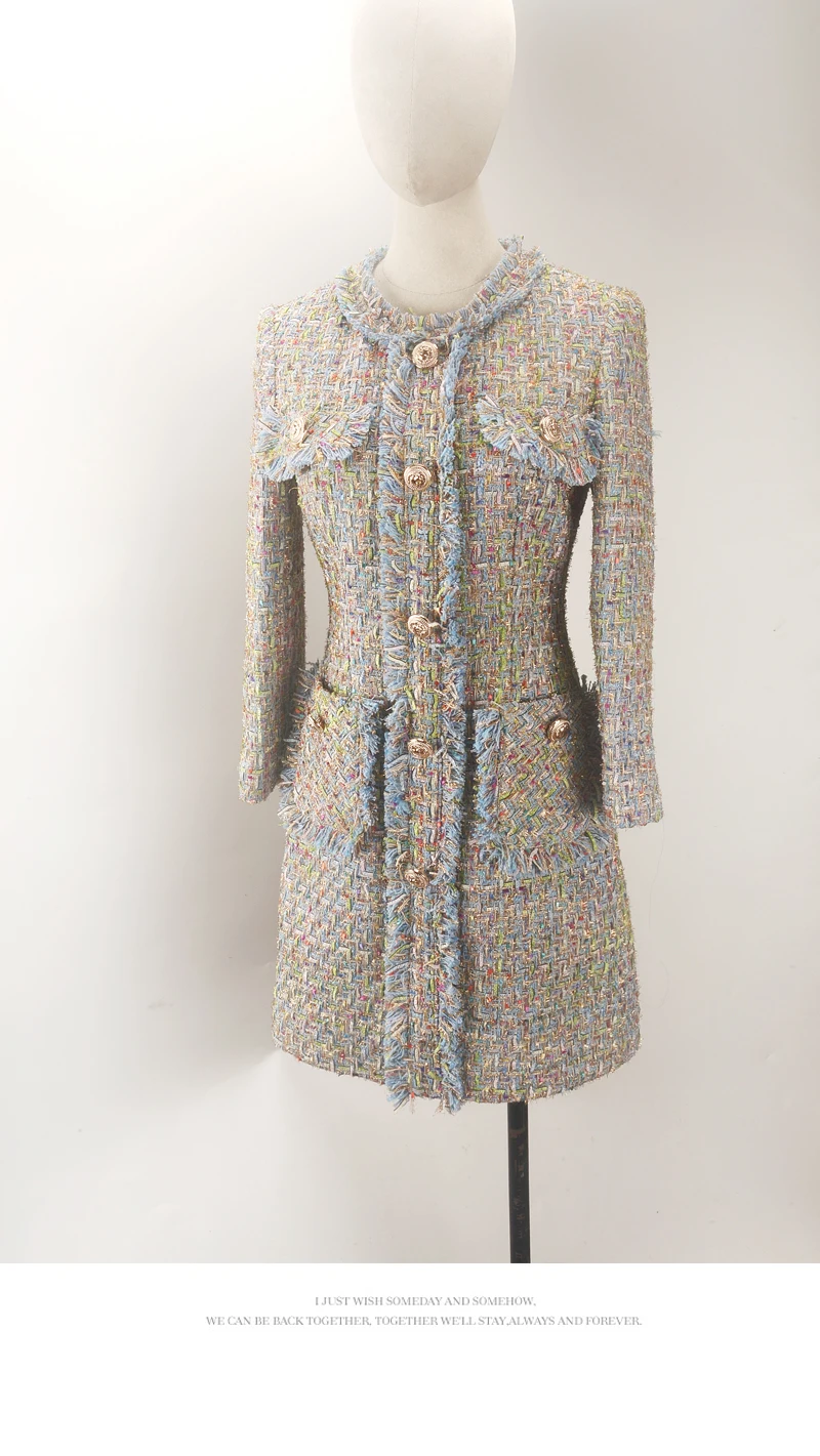 Женское твидовое платье с длинным рукавом, длинная юбка с бахромой и круглым вырезом, осень 2019