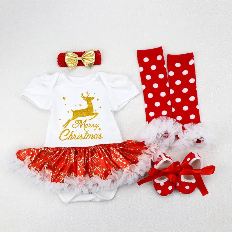 Летнее платье для маленьких девочек Рождественская Одежда для маленьких девочек детское кружевное платье-комбинезон с оленем + повязка на голову + леггинсы + обувь, 4 предмета, vestido infantil