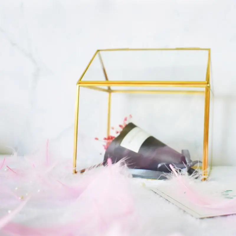 Настольная витрина с прозрачными стеклянными панелями и прочной латунной металлической рамкой.