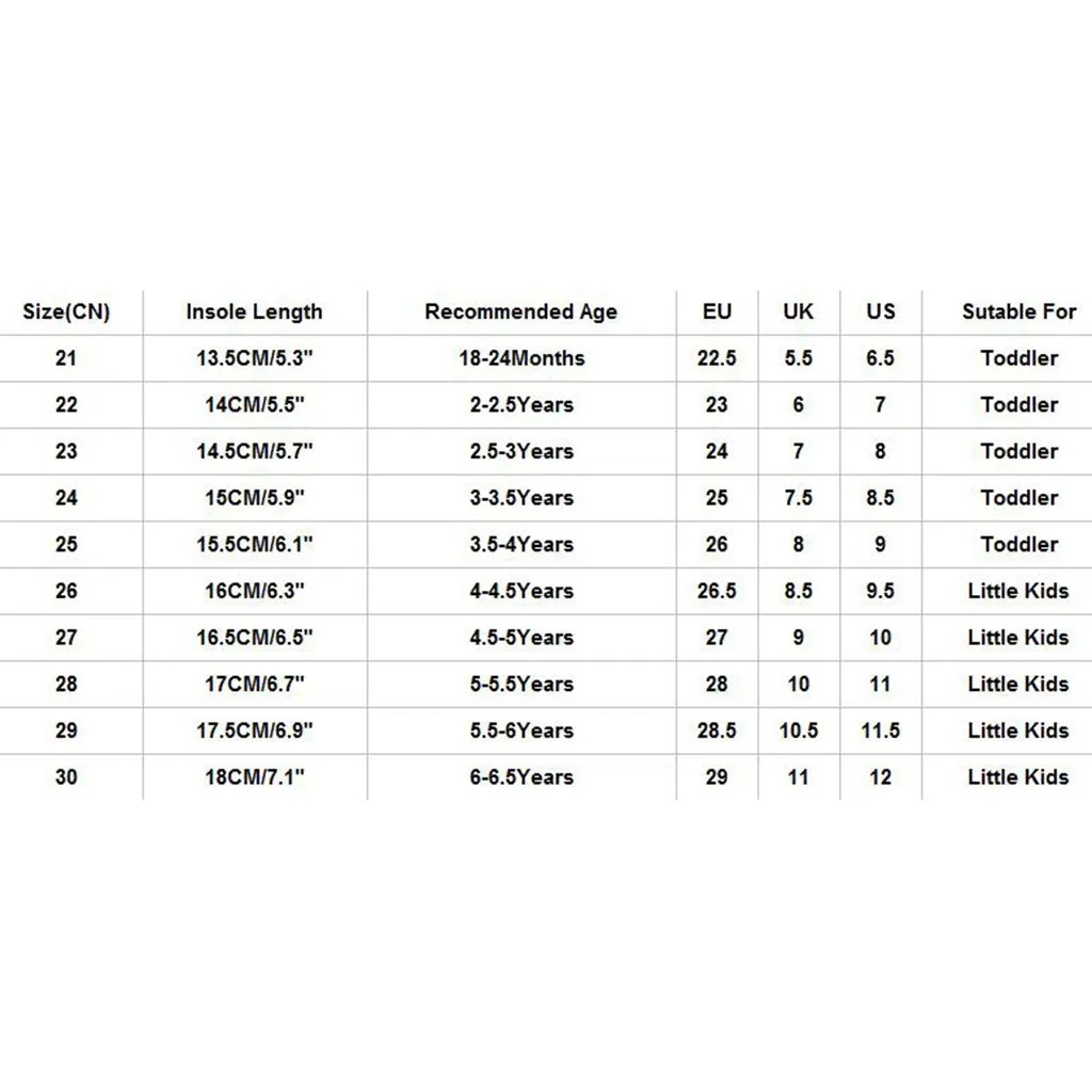 | Размер (CN): 21 | Длина стельки: 13,5 см/5,3 дюйма | Рекомендованный возраст; ширина: 18-24Months | ЕС: 22,5 | Великобритания: 5,5 | Свяжитесь с нами: 6,5 | Удобен для: для детей ясельного возраста |