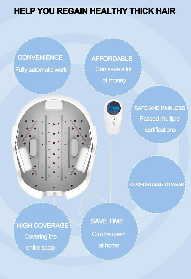 Время облучения: 20 минут, 2 раза в неделю поглощение ткани лазерной энергией = Мощность облучения * время облучения. Для лазерного излучения LPT критическое время облучения. 20 минут-это подходящее время для активации волосяного фолликула. 1,4-18 недель секрецию масла, и выпадения волос будет назад к нормальному уровню. 2,8-26 недель, уход за волосами, возможно изготовление утепленного варианта модели более полные (полный), более блестящий (здоровый) 3,26-52 недели, волосы поставляется в полный рост, и объема волос значительно увеличились