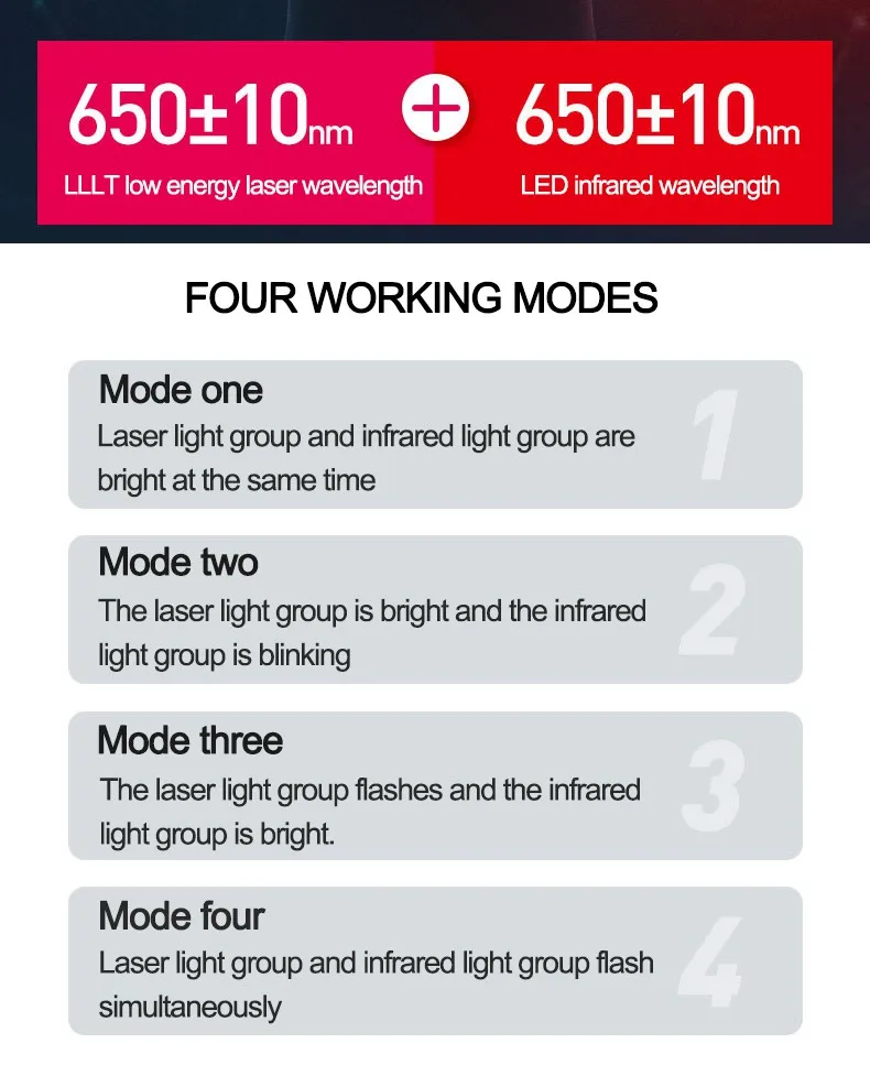 Количество Лазеров: 26 Длина волны лазера: 650 +/-10 нм Количество светодиодов: 30 ipot: AC100-240V Выход: 5 в пост. Тока Вес нетто: 600 г