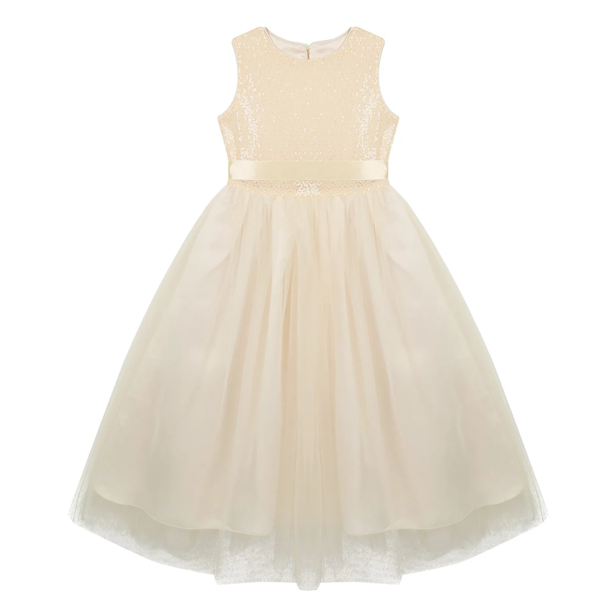 Дизайн с высокой талией, завязка сзади. Скрытая молния сзади. 4 слоя платья, 2 слоя сетки, 1 атласный слой, 1 слой подкладки. Красивое и элегантное платье для вашей девочки.