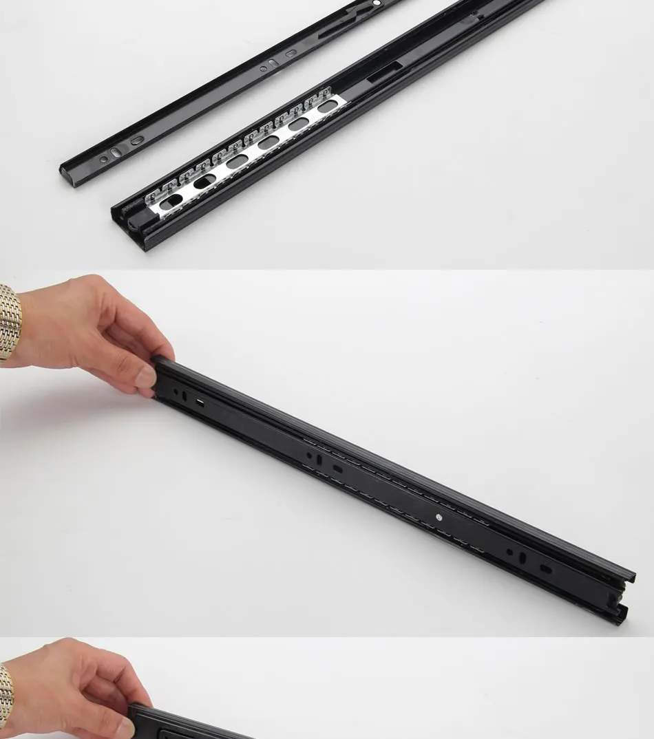 1. Double spring, play the role of buffer closing force 2. Damping buffer, slowly closed, to achieve the mute effect 3. Buckle design, closed to a certain position will automatically shut down 4. Fixed card slot, lock slide, avoid drawer automatically open 5. Steel plate plating by black , can be used in the kitchen, bathroom. Balcony and other wet places. stainless 6. Double solid steel ball, drawing smooth, strong balance