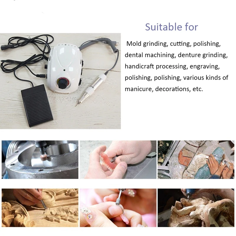 Полировщик для ногтей разработан с инженерными принципом и является стильным. В высокого качества двигатель запускается без шума. Шлифовальные дрели могут использоваться взаимозаменяемо, и их можно поворачивать вперед и в обратном направлении, чтобы регулировать скорость. Он имеет функции шлифовки, полировки, разгрузки, пилинга, гравировки и дужки.