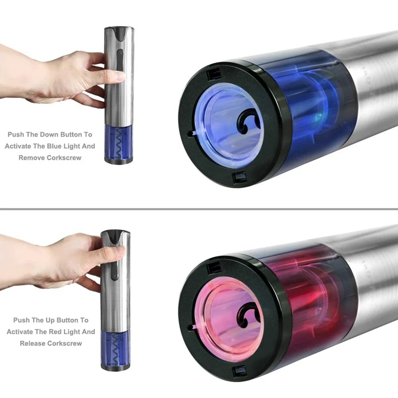 Простой в использовании-беспроводной Электрический штопор удаляет и выпускает пробку за считанные секунды без лишних усилий. Чувствительная кнопка, кнопка вниз вытягивает пробку из бутылки, кнопка вверх отпускает пробку.