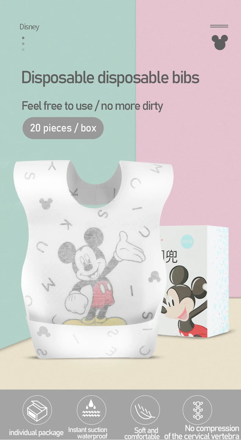 Бренд продукта: Disney Название: Простые нагрудники Характеристики продукта: 20 шт./кор. Цвет: Микки, Минни Размер изделия: 34 см * 22,5 см Подходящий возраст: 3 месяца и более Материал: Нетканая ткань, абсорбирующая бумага, полиэтиленовая пленка Примечания: ручное измерение, есть небольшая погрешность, пожалуйста, имейте в виду