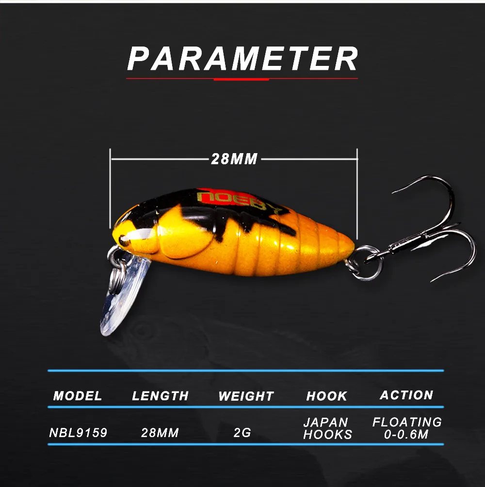 NOEBY приманка от насекомых NBL9159 28 мм 2 г плавающая жесткая приманка для окуня Щука приманка Walleye форель пластиковая рыболовная воблер, твердая приманка для плавания Технические характеристики: 1. Бренд: NOEBY 2. Тип: приманка для суставных насекомых 3. Цвет: 8 цветов, как показано на фотографии, может быть небольшая разница в цвете. 4. Длина: 28 мм 5. Вес: 2 г 6. Действие: плавающий 0-0,3 м 7. Крючок: VMC (или BKK) тройные Крючки Особенности: 1. Искусственная приманка-насекомое, имитирует насекомых, которые всегда нападают на некоторых агрессивных рыб. 2. Как плотоядная, так и вегетарианская рыба привыкли есть утопающее насекомое, поэтому приманка для насекомых может поймать самую высокую скорость рыбы. 3. Острые и прочные тройные Крючки VMC (или BKK). В посылка включает в себя: Цельнокроеное платье насекомых приманка