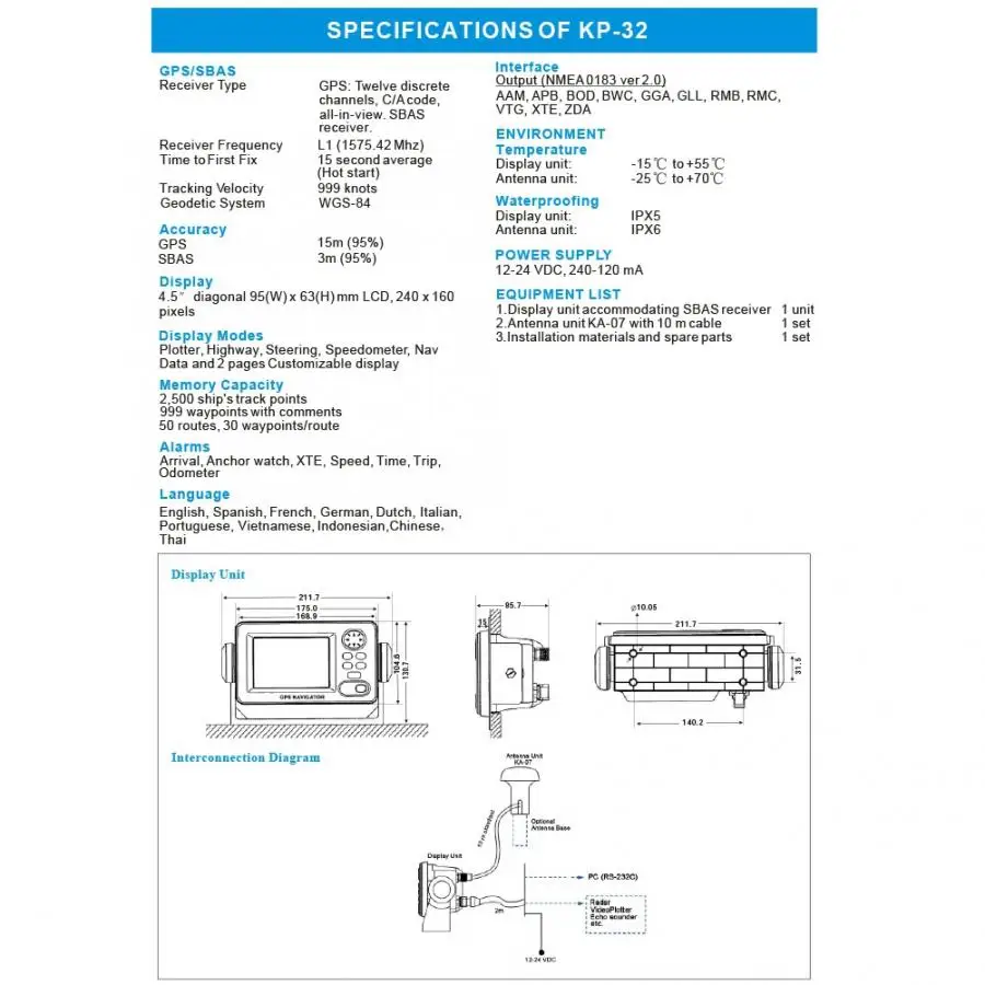 KP-32 является передовым gps-навигатором с приемником SBAS, предназначенным для кораблей, рыбацких лодок и яхты для отдыха. Он полностью функциональный, быстрый позиционирование и использует ориентацию SBAS. Он хранит до 2500 точек и очень удобен в использовании.