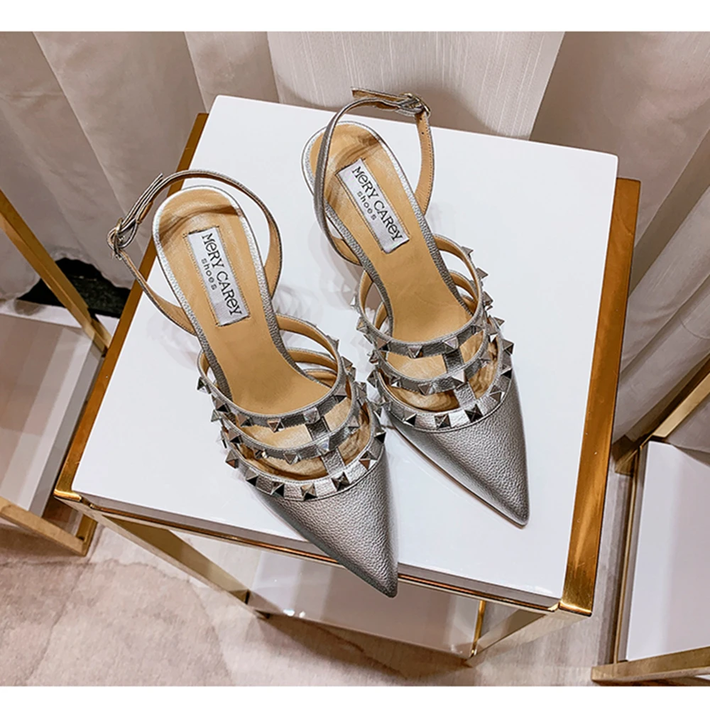 Junetxin/Дизайнерские Красные босоножки на высоком каблуке с закрытым носком и заклепками; Женская обувь из натуральной кожи с острым носком; Роскошные брендовые туфли-лодочки на тонком каблуке