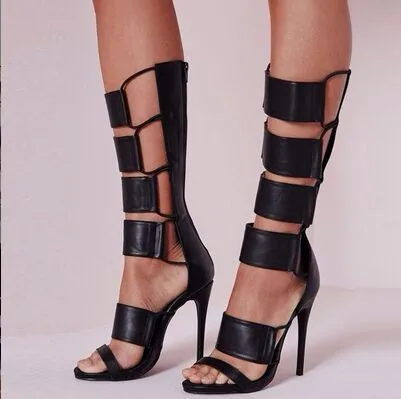 Красивые модные черные кожаные ботинки на молнии, с открытым носком, на высоком каблуке 11 см. Размер: 35-43