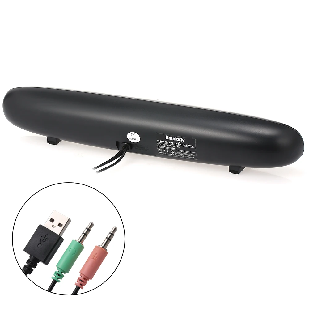 * Звуковая панель с питанием от USB идеально подходит для компьютеров, не беспокоясь о том, что они выключены. Два 3,5 мм аудио порт, благодаря чему вы сможете подключить к наушникам и микрофонов.