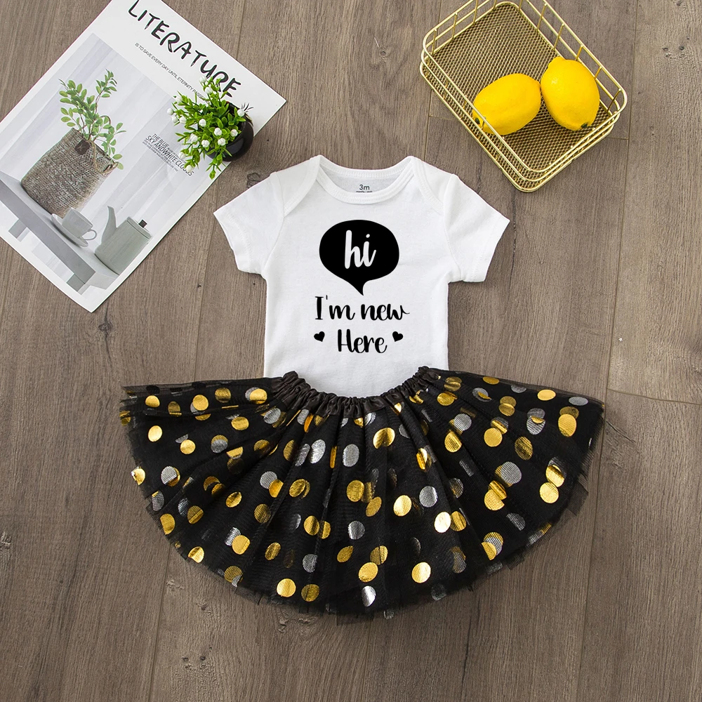 Комплект повседневной хлопковой одежды для новорожденных, Hi I'm New Here, комплект из 2 предметов, юбка-пачка для маленьких девочек + комбинезон с короткими рукавами, комплекты одежды