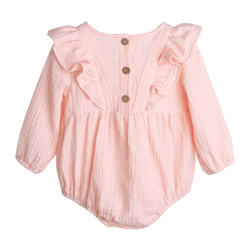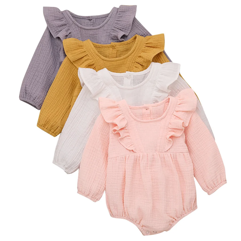 Однотонный льняной комбинезон с оборками и пуговицами для новорожденных мальчиков и девочек; Боди; Одежда
