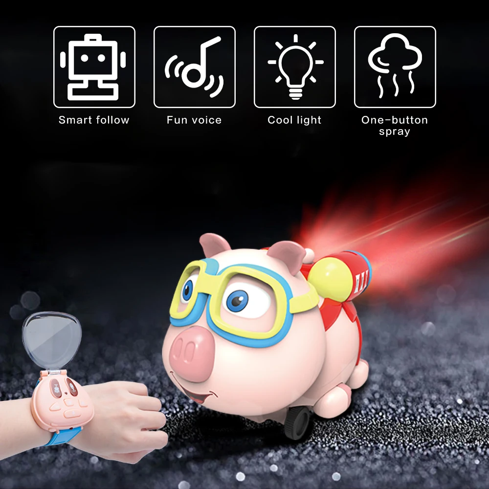 Эта игрушка-робот-копилка симпатичная, с носимым пультом дистанционного управления, легко использовать. Частота 2,4 ГГц, вы никогда не получите никаких помех при воспроизведении. Эта игрушка-копилка может двигаться вперед, назад, повернуть налево и направо. С одной клавишей спрей, функция "Следуйте за мной", очень интересный.