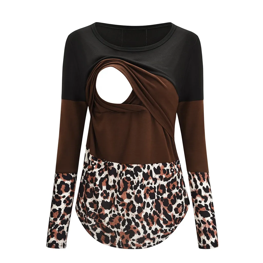 Women Maternity Long Sleeve Leopard Print Nursing Tops T-shirt For Breastfeeding
