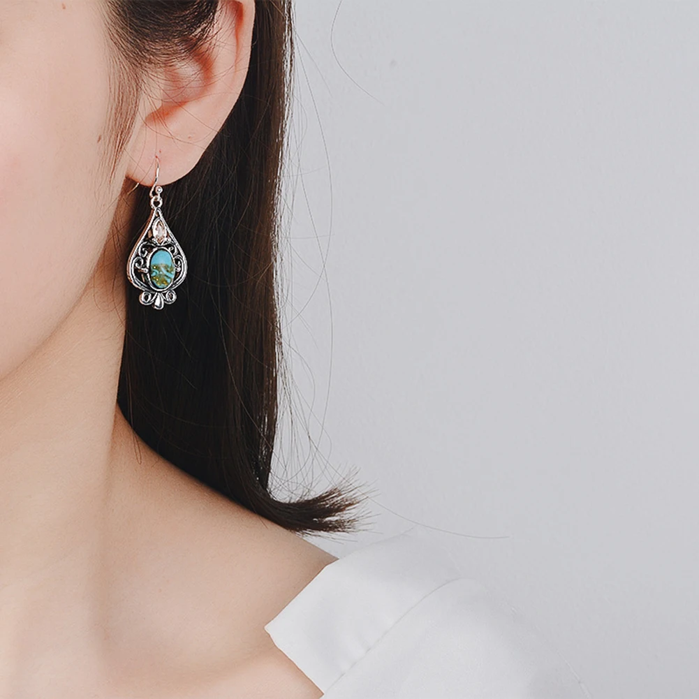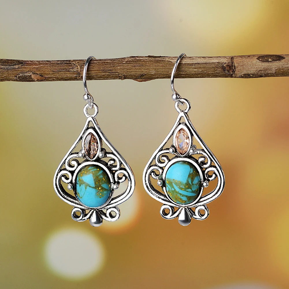 Винтажные женские резные серьги с искусственным бирюзовым опалом, серьги для ушей крючки вечерние ювелирные изделия подарок