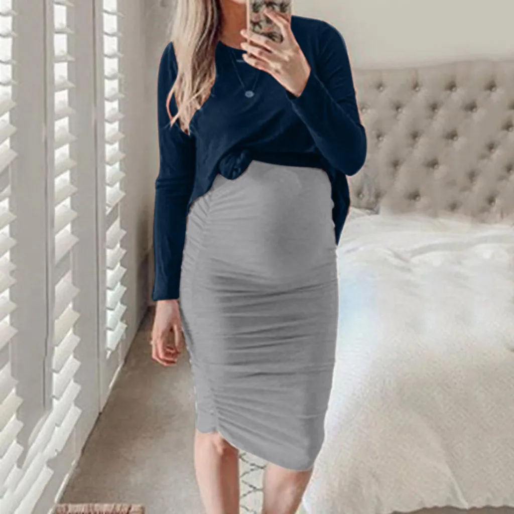 Женский комплект одежды для беременных с круглым вырезом и длинным рукавом, Однотонная юбка