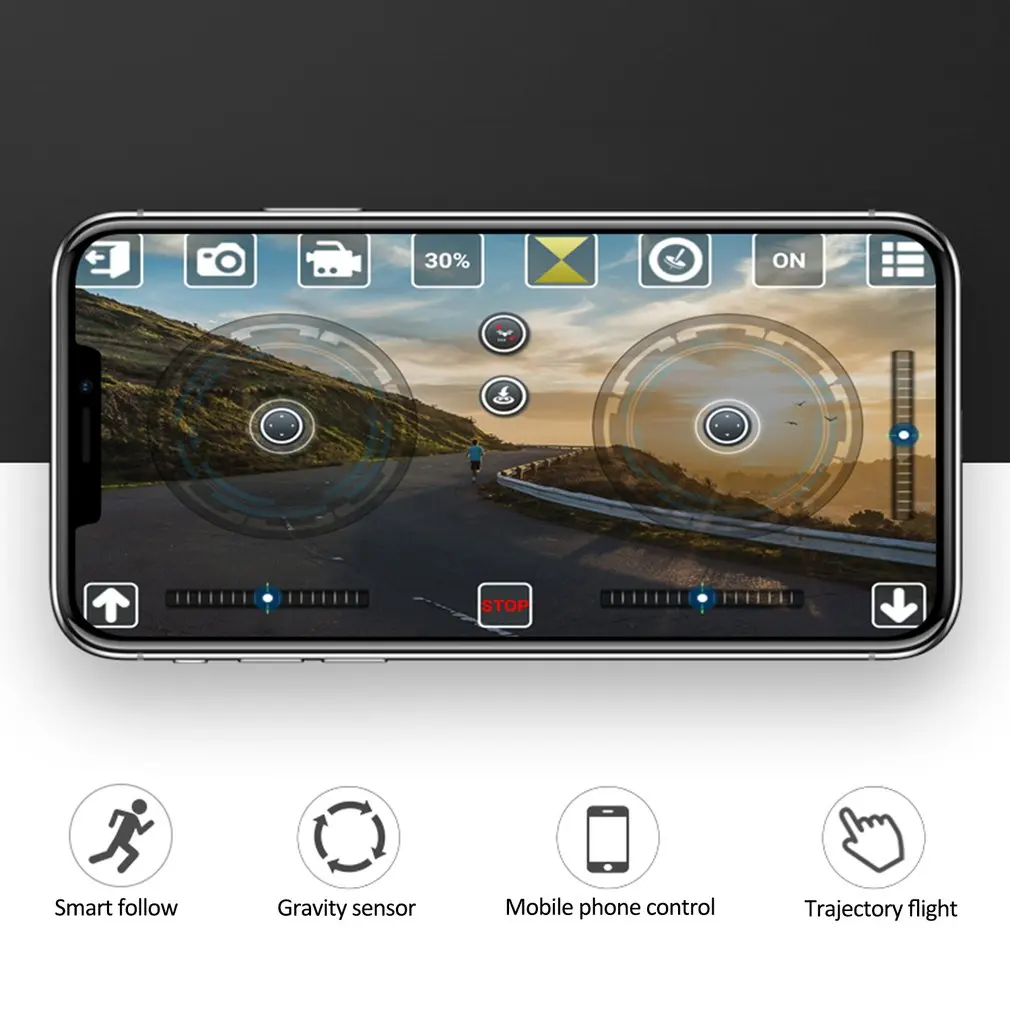 Длительное время работы от аккумулятора, жест фото жест видео, 4 канала, светодиодный свет/6-осевой гироскоп вертолет с гироскопом функция тарирования/вверх, вниз, вперед, назад, движение задним ходом, левый поворот, правый поворот, hover/fast, без режима головы/360 градусов опрокидывание, возврат одной кнопки/Управление мобильным телефоном Wi-Fi, точная высота, Фото, видео, трек-полет