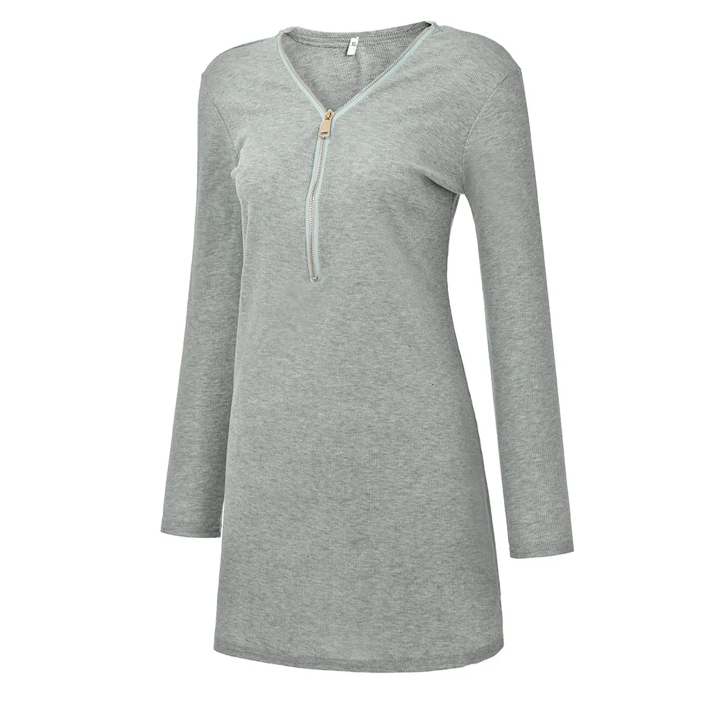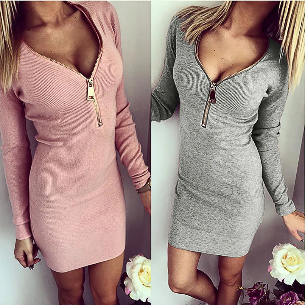 Модное женское сексуальное однотонное мини-платье с v-образным вырезом и длинным рукавом на молнии