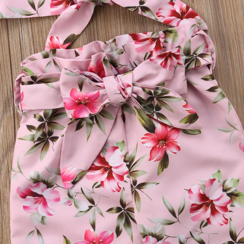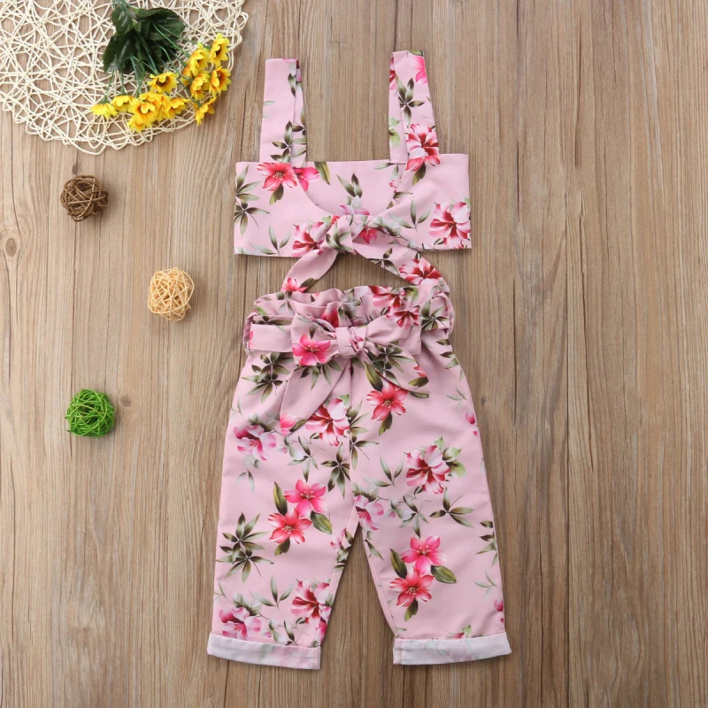 AU/комплект из 2 предметов; летний детский топ с бантом и цветочным принтом для маленьких девочек; жилет + штаны с бантом; комплект одежды