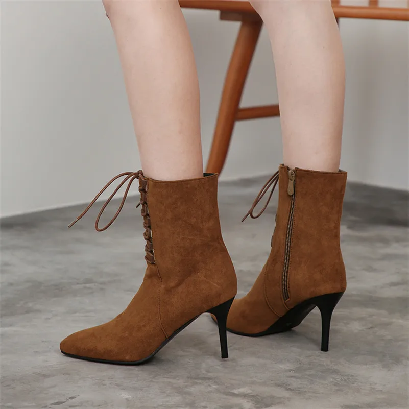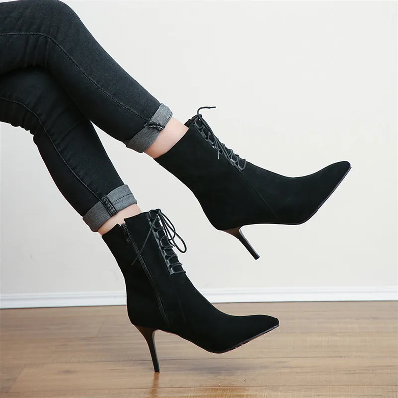 ANNYMOLI/женские ботинки; Зимние ботильоны на молнии; Короткие ботинки на тонком каблуке; Обувь на очень высоком каблуке со шнуровкой; Женская Осенняя обувь размера плюс 46