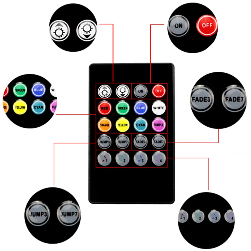 -Режим управления: 4 режима управления музыкой, 8 режимов контроля цвета сигнала, контроль яркости, включение/выключение, 2 режима переключения сегментов, управление режимом выцветания и отключения 2 режима.