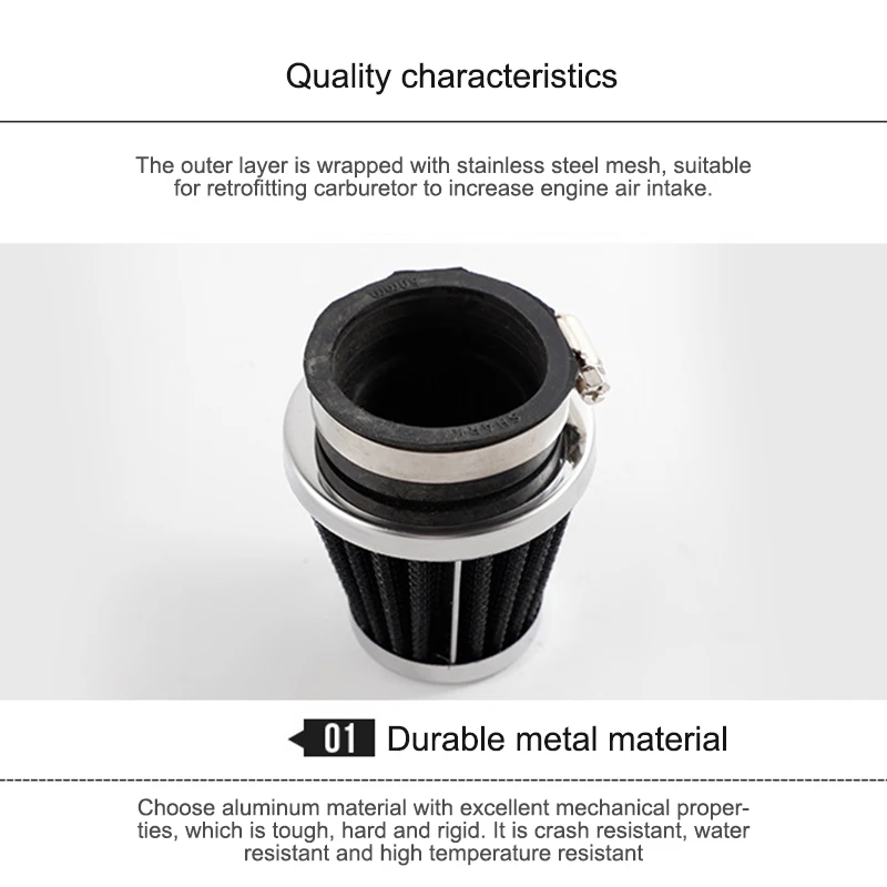 Он подходит для модифицированного автомобильного карбюратора для увеличения объема впускного воздуха двигателя, подходит для различных моделей компоновки моторного отсека, увеличения потока впускного воздуха и фильтрации примесей воздуха.