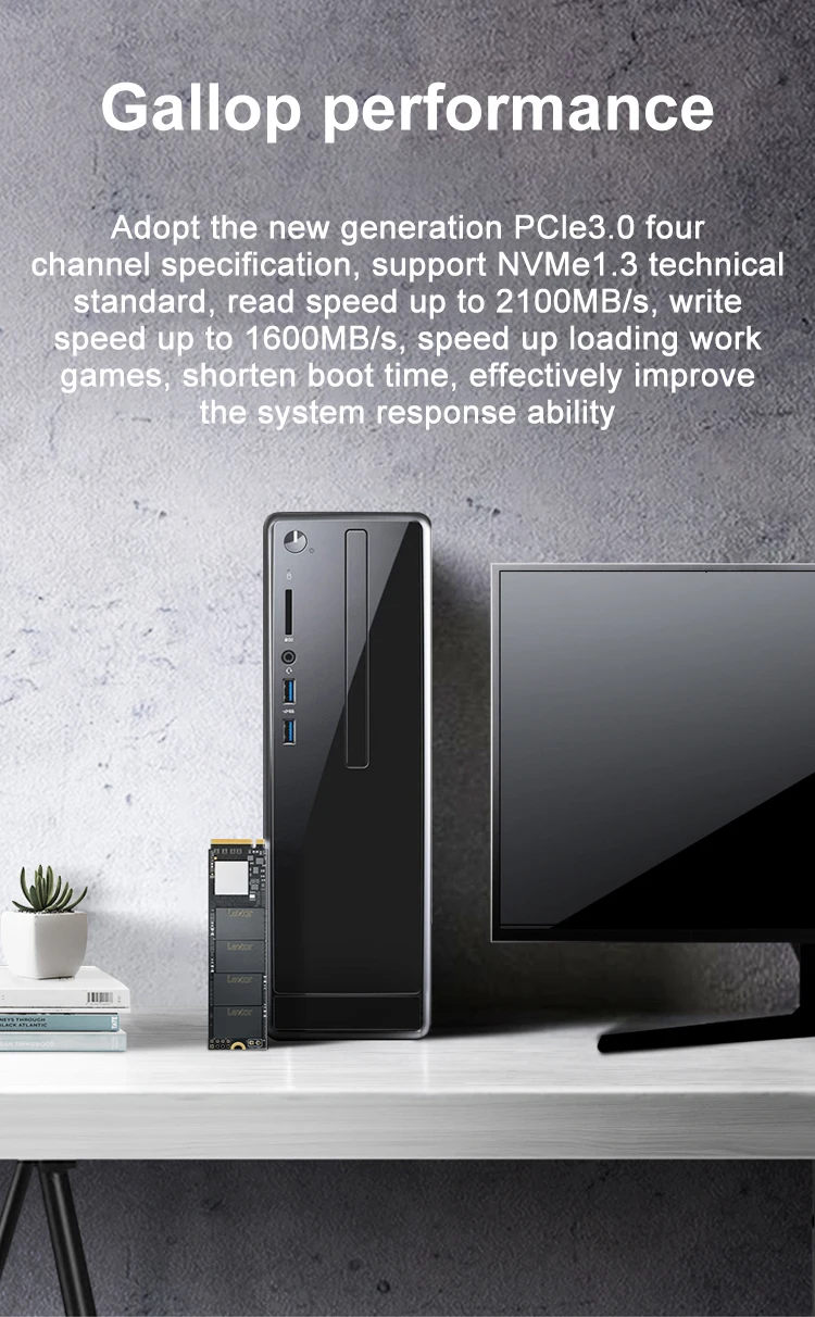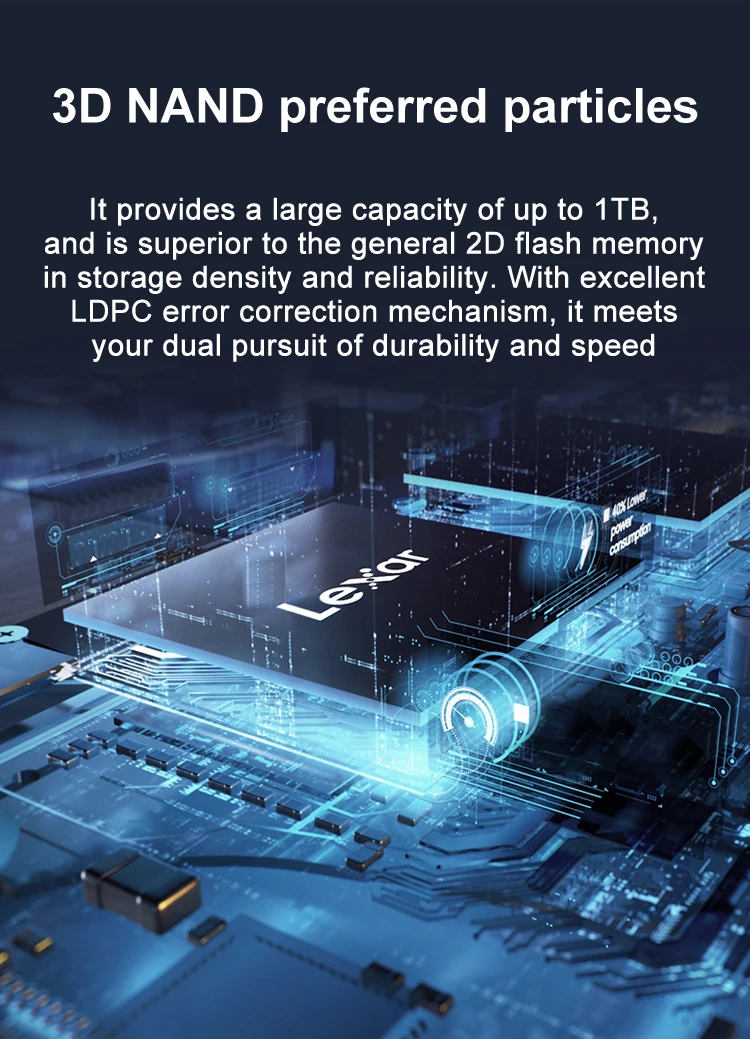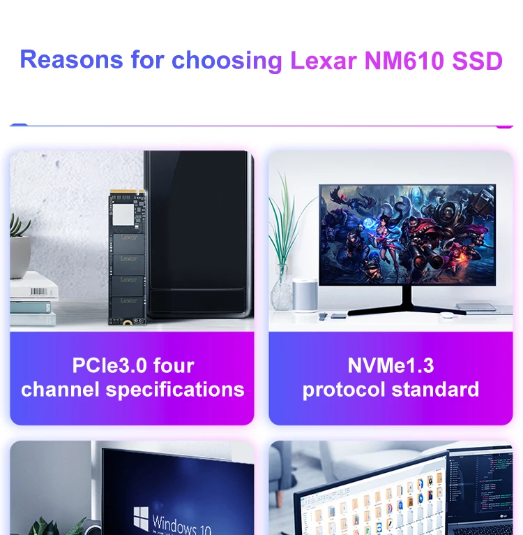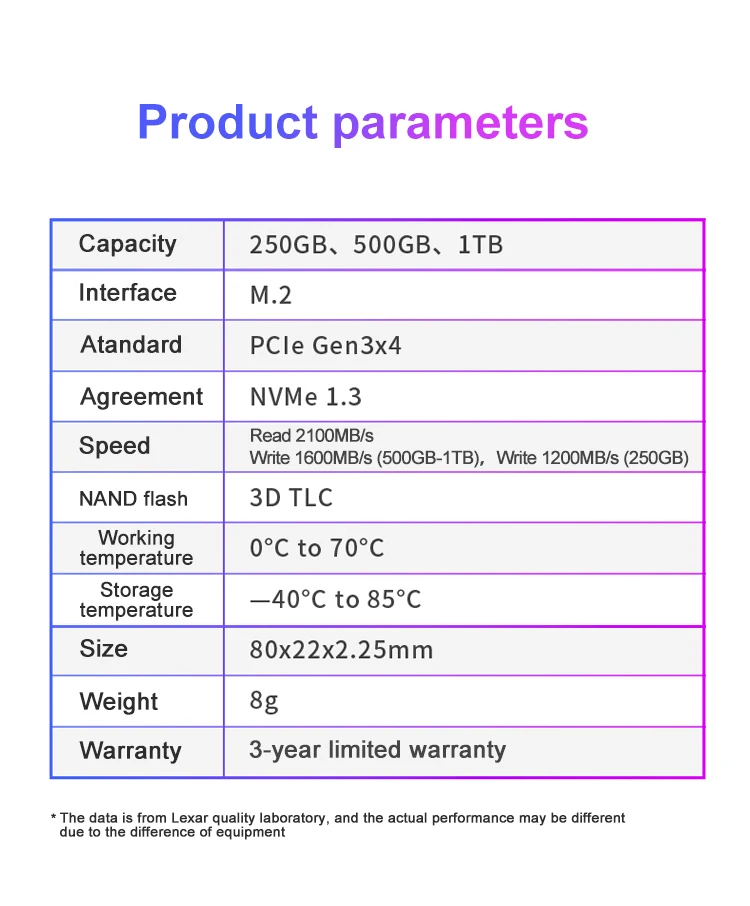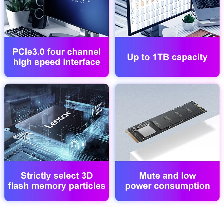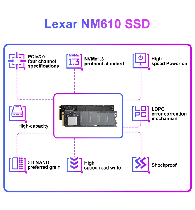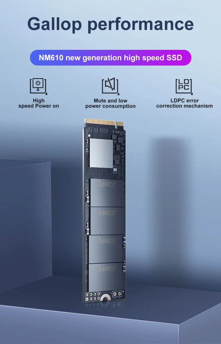 Lexar NM610 3D NAND SSD 250 ГБ 500 ГБ 1 ТБ M.2 2280 NVMe PCIe Gen3.0 x 4 Внутренний твердотельный жесткий диск для ноутбукаОсобенности:1. Высокоскоростной PCIe Gen3x4 интерфейс: 2100 МБ/с./с чтение и 1600 МБ/с./с write1 -NVMe 1,3 поддерживается2. M.2 2280 форм-фактор3. Получите 3,5x скорость SSD на базе SATA4. Идеально подходит для любителей ПК5. 3D NAND6. Особенности LDPC (проверка паритета низкой плотности)7. Ударопрочность и вибрация без движущихся частей8. Трехлетняя ограниченная гарантия Характеристики:Емкость:250 ГБ 500 1 ТБФорм-фактор:M.2 2280Интерфейс:PCIe Gen3.0 x 4Скорость:250 ГБ последовательного чтения до 2000 МБ/с. читать, последовательного чтения до 1200 МБ/с.Ввода-вывода в секунду: до 110/151K500 Гб последовательное считывание до 2100 МБ/с./с чтение, Последовательная запись до 1600мб/сIOPS: до 188/156K1 ТБ последовательное считывание до 2100 МБ/с./с чтение, Последовательная запись до 1600мб/сIOPS: до 188/156KNAND flash:3D TLCРабочая температура:От 0 °C до 70 °CТемпература хранения:От-40 °C до 85 °CУдаропрочный:1500G, продолжительность 0,5 мс, половина Синусоидальная волнаУстойчивость к вибрациям:10 ~ 2000 Гц, 1,5 мм, 20 г, 1 октября/мин, 30 мин/ось (X,Y,Z)TBW:250 ГБ: 125 ТБ, 500 Гб: 250 ТБ, 1 ТБ: 500 ТБDWPD:250 ГБ: 0,46, 500 Гб: 0,46, 1 ТБ: 0,46MTBF:1500000 часовРазмеры (Ш x Д x В):80x22x2,25 мм/3,15 "x 0,87" x 0,09»Вес:9 г
