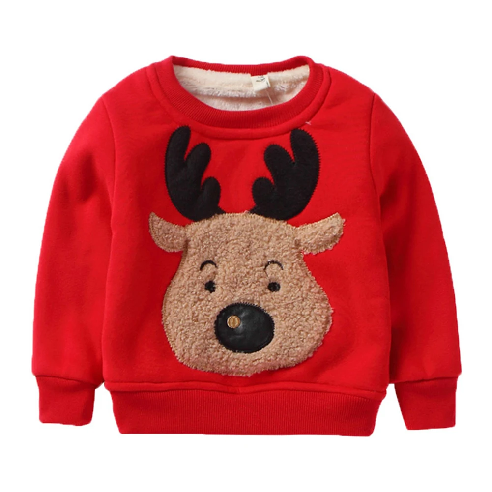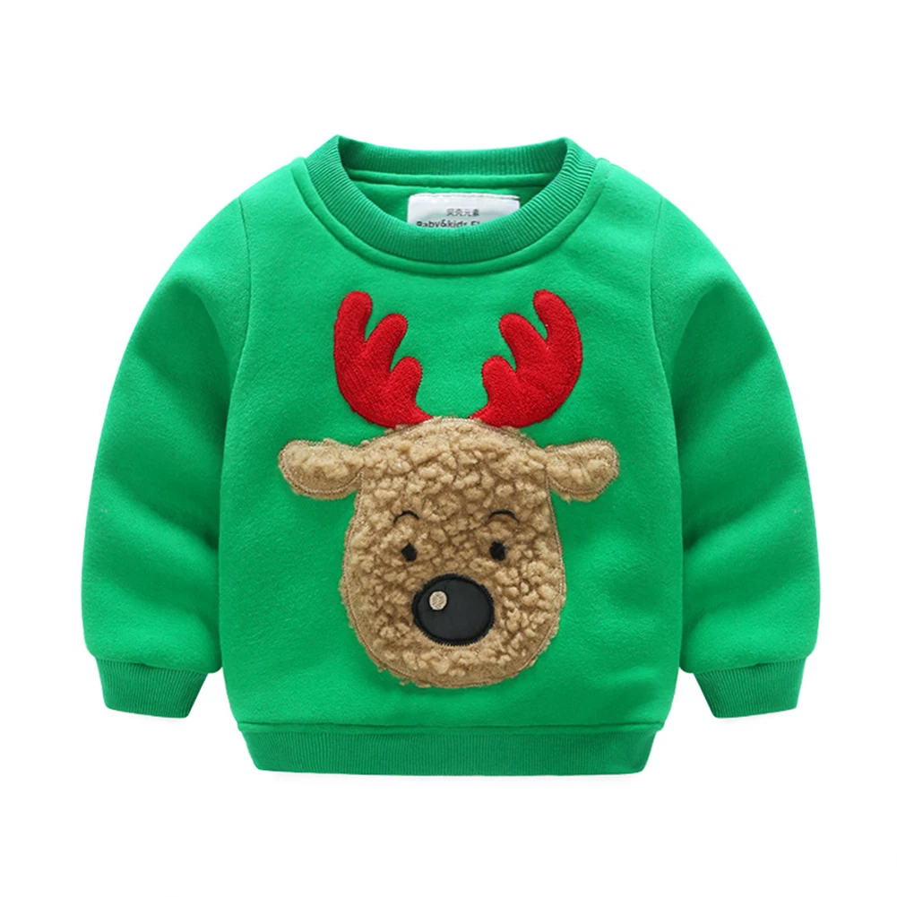 Рождественский олень с забавными рисунками рождественской и новогодней счастливой атмосферой, круглый воротник (вырез под горло), однотонные цвета, делают ваших детей мальчиков и девочек более особенными, милыми, очаровательными и привлекательными.