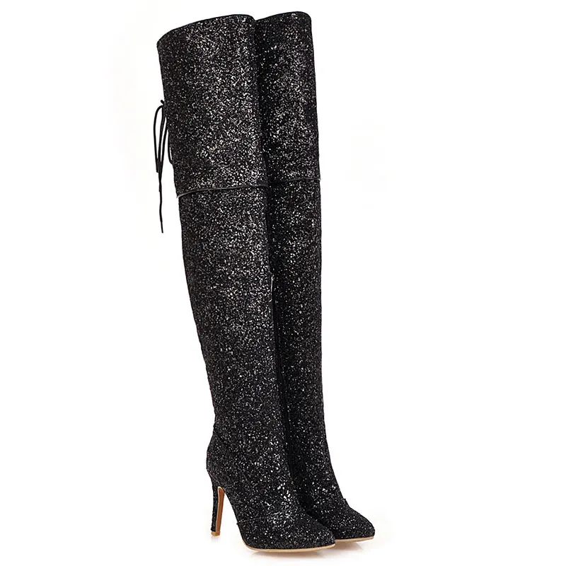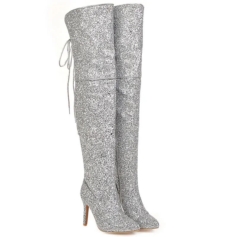 Sgesvier/Свадебные сапоги до бедра, расшитые блестками; Женская обувь; Цвет золотой, серебряный, красный; Пикантные вечерние женские сапоги на тонком высоком каблуке под платье