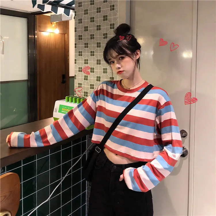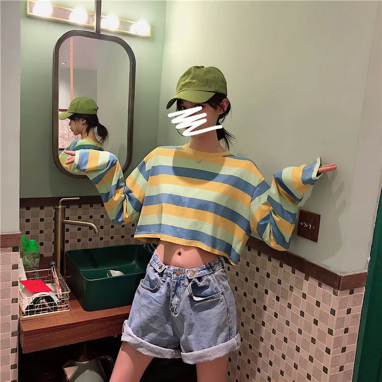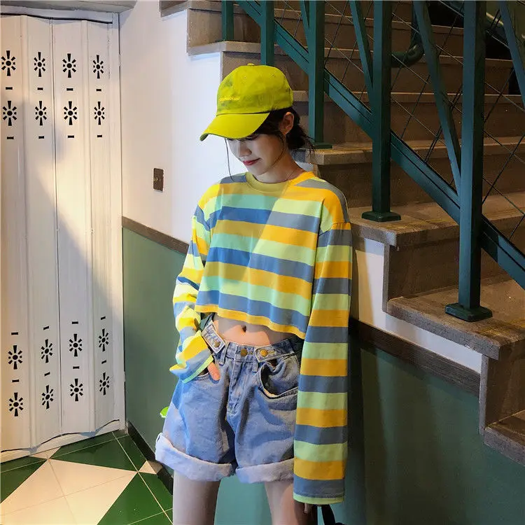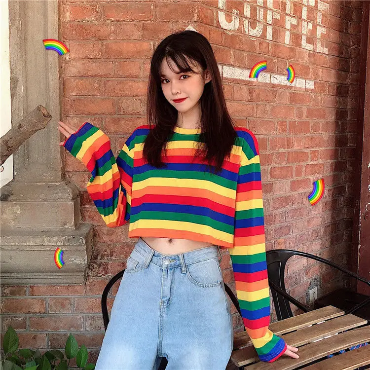 Harajuku короткий укороченный топ Радужная полосатая футболка с длинными рукавами