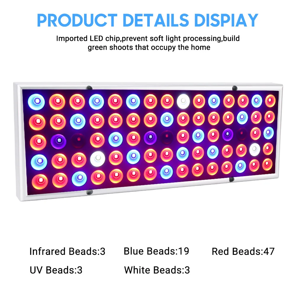 Модернизированный растущий свет был разработан с полным спектром (47red + 19blue + 3UV + 3IR + 3White), дает идеальную длину волны для всех растущих сцен. Подходит для посева, прорастания, вегетативного и цветения.