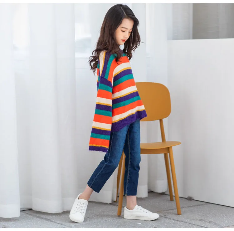 1 цветной Полосатый Вязаный топ для девочек свитер Одежда 2 Новые Модные осенние свитера 2019 года детская одежда 3 Детские хлопковые пуловеры с длинными рукавами; Одежда для девочек