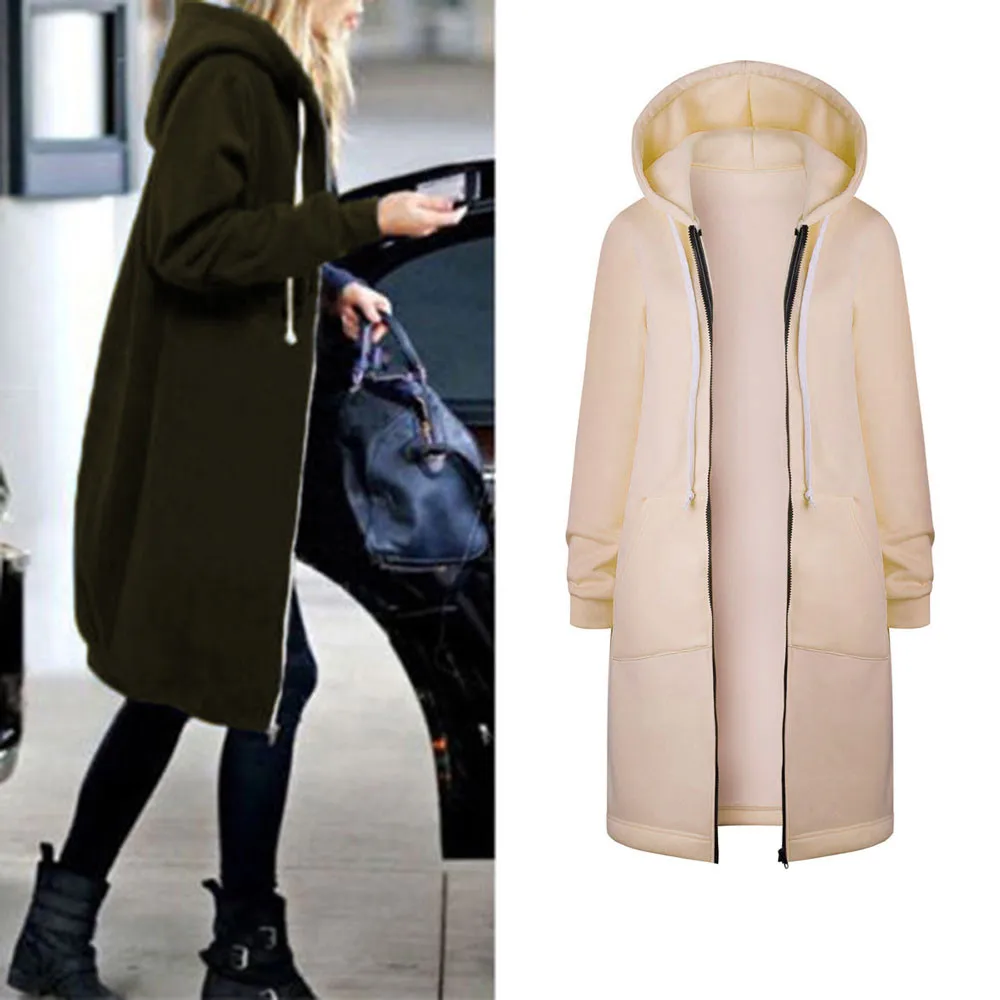 Длинная ветровка женская теплая молния открытая толстовка с капюшоном Длинная Куртка Верхняя одежда Простой модный длинный кардиган Тренч пальто