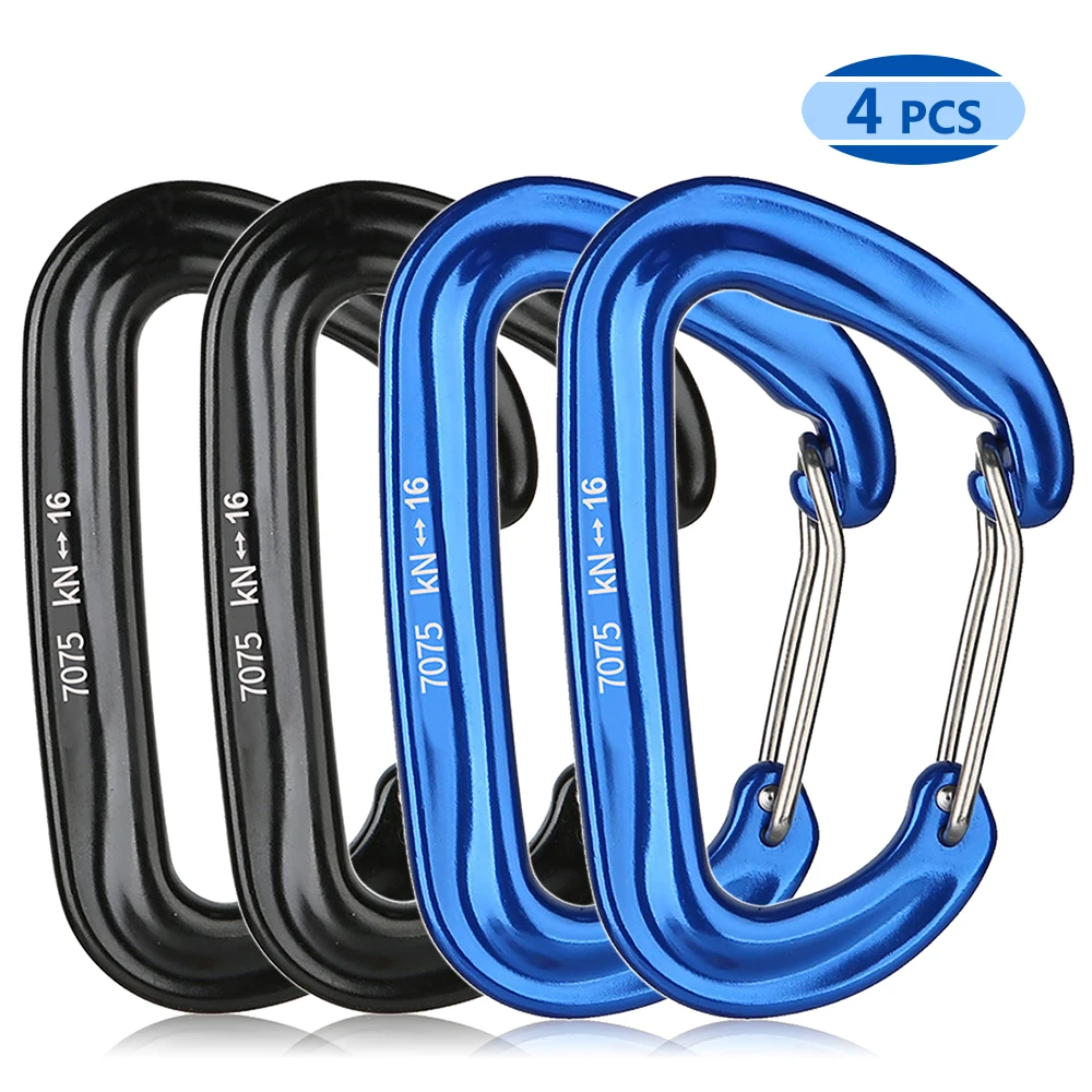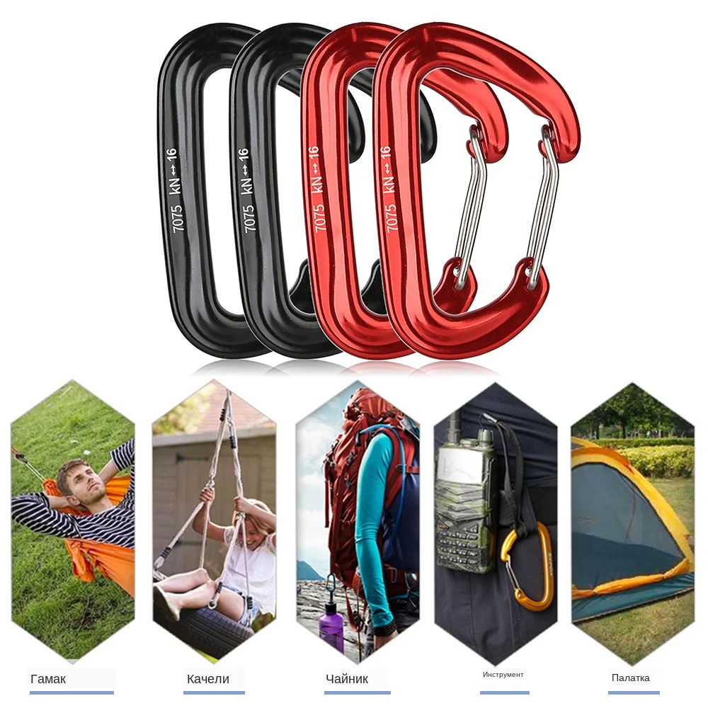 Особенности: Изготовлен из высококачественного алюминиевого сплава, стабильный и прочный. Каждый карабин может вместить до 16 кн.(1600 кг/3527lb) Быстросъемные Пружинные ворота позволяют легко управлять одной рукой. D образный дизайн с большим размером открывания ворот (макс. 1,8 см/0.7in). Подходит для дома, лодки, гамаков, кемпинга, пеших прогулок, альпинизма и т. Д.