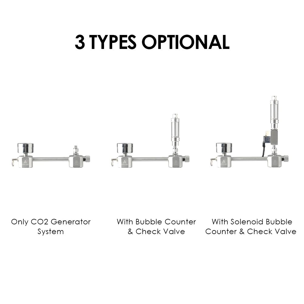 3 типа Дополнительно: система генератора CO2/система генератора CO2 + Счетчик пузырьков с обратным клапаном/система генератора CO2 + Счетчик пузырьков с обратным клапаном + соленоид