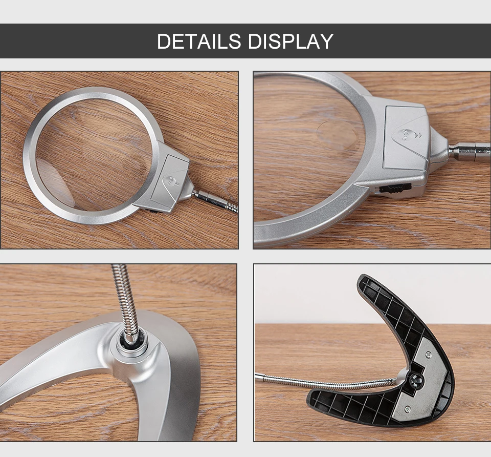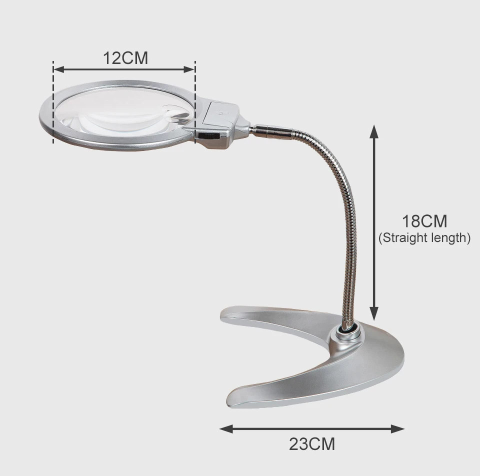 | Диаметр линз: 125 мм (большой объектив), 25 мм (маленький объектив) Увеличение: 2 раза (большой объектив), 5 раз (маленький объектив) Количество СВЕТОДИОДНЫЙ светильник: 2 Светодиодный источник питания: 3 * AAA батареи (не входят в комплект) Цвет: серебристый Вес изделия: около 520 г/4,26 унций Размер упаковки: прибл. 24,5*19,5*7,5 см Вес посылка: около 690 гПосылка: 1 * Светодиодный металлический шланг лупа 1 * Гибкий металлический шланг 1 * Металлическое основание 1 * коробка |