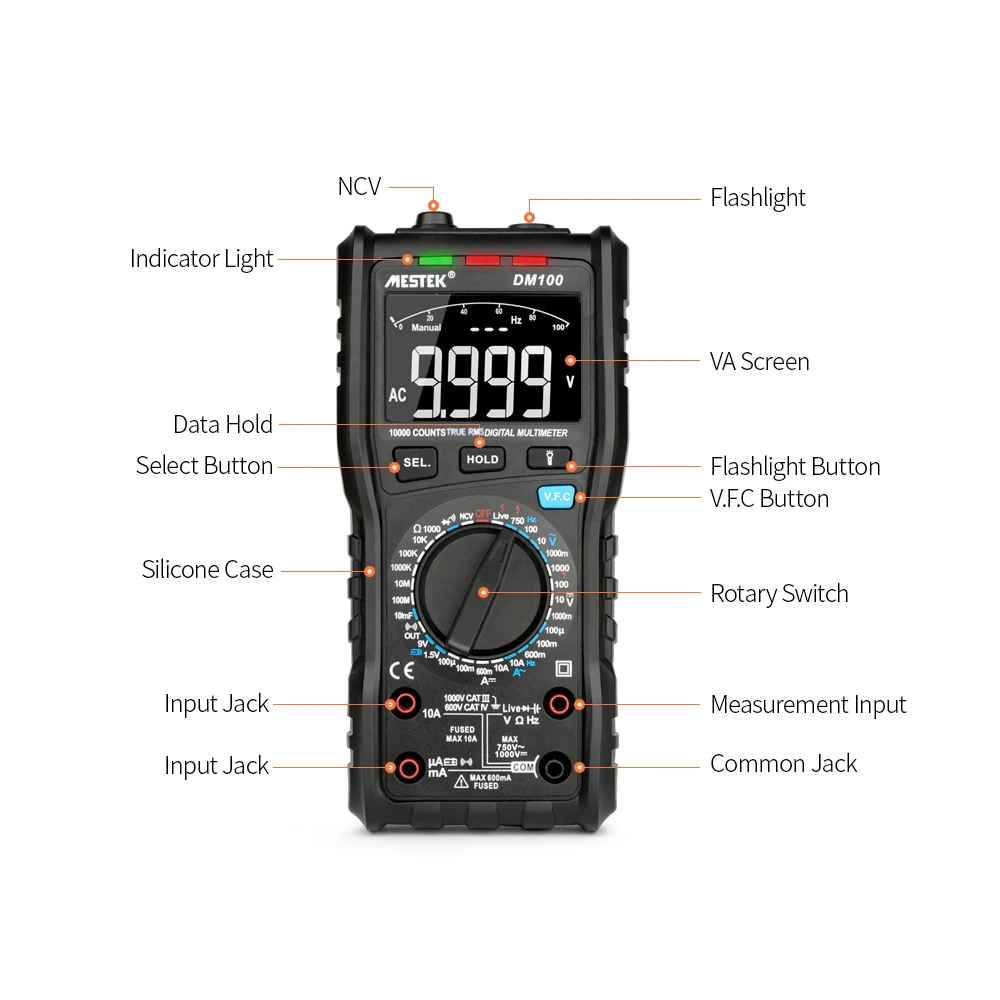 Высокоскоростное измерение напряжения, сопротивления, емкости. V.f. C Функция измерения напряжения переменной частоты, NCV Бесконтактное измерение напряжения, AC напряжение и частота тока тест, автоматическая идентификация диода и ВКЛ/ВЫКЛ.
