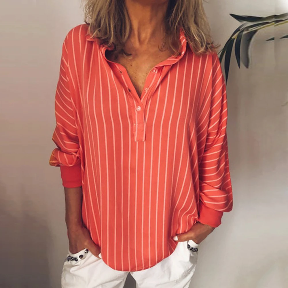 Осенние женские повседневные Полосатые блузки с v-образным вырезом свободные топы Туника футболки свободные шикарные женские офисные свободные блузки сексуальные большие размеры