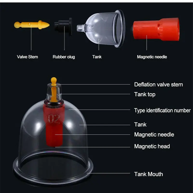 1. Привлекательный дизайн и прочный, прочный и ударопрочный материал. 2. Прозрачный корпус: легко регулировать внутреннее давление, и внутренняя обработка может быть четко видна. 3. Безопасное и хорошее уплотнение: Гладкий край дуговой чашки увеличивает площадь, соединяющую с кожей, что подтверждает лучшее уплотнение. 4. 7 размер чашки подходит для всех частей тела. 5. Простота в эксплуатации: огонь и электричество не требуются, безопасны и надежны, просты в эксплуатации.