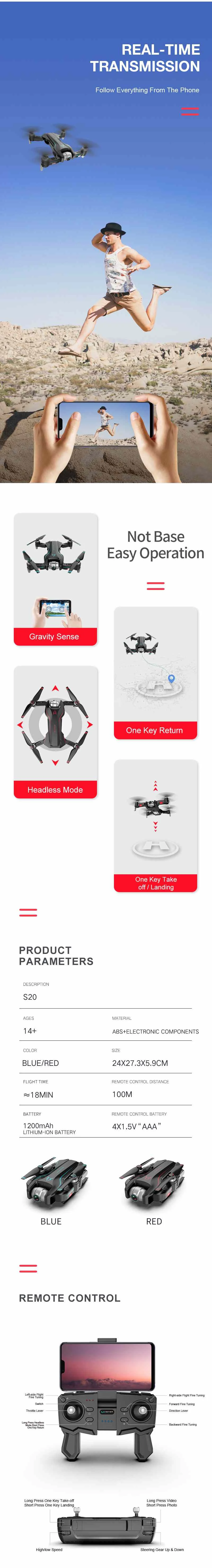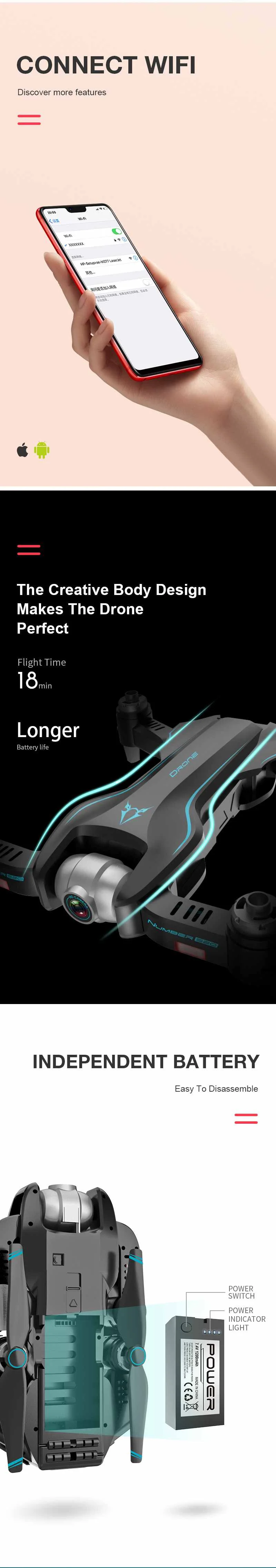 Function: Up/down, Forward/backward, Turn left/right, Sideward flight, Headless Mode, Follow Me, Surrounding Flight, Waypoint Flight, Altitude Hold Mode, WiFi FPV, Camera/Video