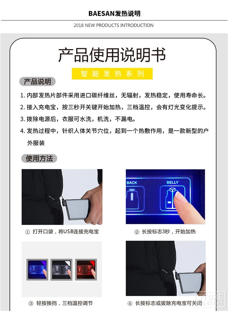 Инструкции для пользователя:1. Удалите usb-разъем 2. Доступ к зарядным сокровищам 3. Нажмите на выходной выключатель зарядного устройства 4. Длительное нажатие на переключатель контроля температуры груди в течение 2 секунд 5. Красный свет мигает для автоматическое регулирование температуры Отопление 6. После того, как красный свет мигает в течение 5 минут, он автоматически включается в белым светом для ручного регулирование температуры отопление. В это время контроль температуры можно отрегулировать вручную. Ручная регулировка контроля температуры делится на три режима, синий свет-низкотемпературный нагрев, серый свет-непрерывное нагревание средней температуры, а красный свет-непрерывное высокотемпературное нагревание. 7. Нажмите и удерживайте переключатель контроля температуры груди в течение 2 секунд, и выключите свет, чтобы остановить нагревание. Инструкции по стирке:1. Снимите мобильный источник питания, добавьте нейтральное моющее средство и постирайте его вручную. Не Надавливайте и не блеките. Перед использованием допускается естественная проветривающаяся чистка одежды.2. Максимальная температура воды при стирке составляет 30 градусов Цельсия3. не отбеливать, не переворачивать и сушить, не гладить, не сушить в чистоте, не отбеливать хлором, ручная стирка, машинная стирка (крышка водонепроницаемого USB чехла можно мыть), аккуратно натирать, промыть.4. Подвешивайте и не вытирайте вручную. Технические характеристики:Вес изделия: 600 гМодель: M/L/XL/2XL/3XL/4XL Предупреждение советы:1. Не используйте долгое время, пожалуйста, не Подключайтесь к мобильному питанию.2. Не используйте горячую воду или сильное кислотное моющее средство.3. Не используйте электричество для влажной одежды. Пожалуйста, выключите питание и перестаньте использовать дождь.4. Время использования зависит от размера зарядки.5. Не подключайте непосредственно к зарядному устройству, пожалуйста, используйте мобильное зарядное устройство в качестве источника питания.6. Мы рекомендуем использовать 5 В/2А для обеспечения хорошего эффекта нагрева. Вопрос 1: имеет ли нагревательная куртка какой-либо вред нашему телу? Ответ: нет, мы используем 5 в неиндуктивное напряжение, которое является передышкой меньше, чем напряжение человеческого тела, что позволяет себе 36 В, не наносит никакого вреда человеческому телу Вопрос 2: поставляется ли нагревательная куртка с power Bank. Ответ: хорошо, банк питания не включен. Вопрос 3: Можно ли использовать мой мобильный банк питания для нагрева одежды? Ответ: ежедневно 5 вольт (или ежедневный банк питания) можно использовать для нагрева одежды ![]()