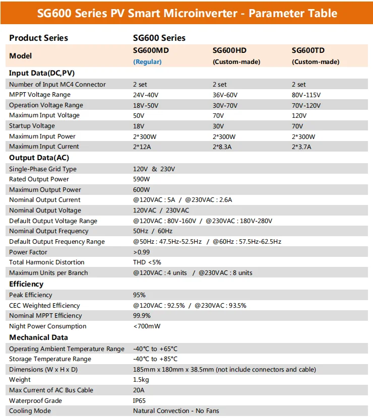 Один блок подключается до двух PV модулей Максимальная выходная мощность 700 Вт переменного тока Однофазный выход, гибкие светодиодные полосы 3 фазы фотоэлектрических систем 2,4G Беспроводная связь и мониторинг Выдерживает до 8 единиц (230 В) на ветку Настраиваемый диапазон различного входного напряжения (DC, PV) Интегрированный кабель шины переменного тока, готов к использованию Низкая стоимость, простая установка Серия продуктов SG600 Модель SG600MD (Обычный) SG600HD (На заказ) SG600TD (На заказ) Входные данные (DC,PV) Количество входных разъемов MC4 2 комплекта 2 комплекта 2 комплекта Диапазон напряжения MPPT 24-40 в 36-60 в 80-115 в Диапазон рабочего напряжения 18-50 в 30-70 в 70-120 в Максимальная Вход Напряжение с алюминиевой крышкой, 50В 70V 120V Напряжение запуска 18 в 30 в 70 в Максимальная входная мощность 2*300 Вт 2*300 Вт 2*300 Вт Максимальная Вход высокого тока 2 * 12A 2 * 8.3A 2 * 3.7A Выходные данные (переменный ток) Однофазный сетки Тип 120V & 230V Номинальная выходная мощность 590 Вт Максимальная выходная мощность 600 Вт Номинальный выходной ток @ 120VAC : 5A / @ 230VAC : 2.6A Номинальное выходное напряжение 120VAC / 230VAC Диапазон выходного напряжения по умолчанию @ 120 В переменного тока: 80-160 в/@ 230 В переменного тока: 180-280 В Номинальная выходная частота 50 Гц/60 Гц Выходной Частотный диапазон по умолчанию @ 50 Гц: 47,5 Гц-52,5 Гц/@ 60 Гц: 57,5 Гц-62,5 Гц Коэффициент мощности> 0,99 Общее гармоническое искажение THD <5% Максимальное количество единиц на ветку при 120 В переменного тока: 4 единицы/@ 230 В переменного тока: 8 единиц Эффективность Максимальная эффективность 95% CEC взвешенная эффективность @ 120VAC : 92.5% / @ 230VAC : 93.5% Номинальная эффективность MPPT 99.9% Ночное энергопотребление <700 мВт Механический данных Рабочая температура окружающей среды от-40 °C до + 65 °C Диапазон температур хранения-40 °C до + 85 °C Размеры (Ш x В x Г) 185 мм x 180 мм x 38,5 мм (не включая разъемы и кабель) Вес 1,5 кг Максимальный ток кабеля шины переменного тока 20A Водонепроницаемый Класс IP65 Режим охлаждения естественная конвекция-нет вентиляторов Другое Особенности Связь (инвертор для DataBox) 2,4G беспроводной Трансформатор высокой частоты переменного тока трансформаторы, гальванически Интегрированное наземное оборудование предоставляется PE в кабеле переменного тока. Никаких дополнительных грунтов не требуется. Функции защиты Изолированная защита острова, защита напряжения, защита частоты, Защита температуры, защита от тока и т. Д. Соответствие конструкции NB/T32004:2013,NB/T32004:2013,EN61000-3-2,EN62109,VDE0126,UL1741 и т. Д.
