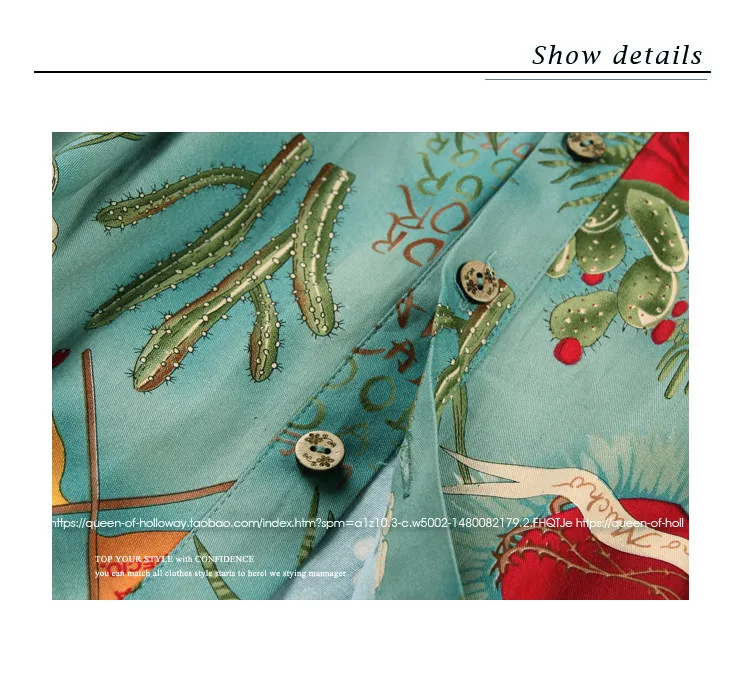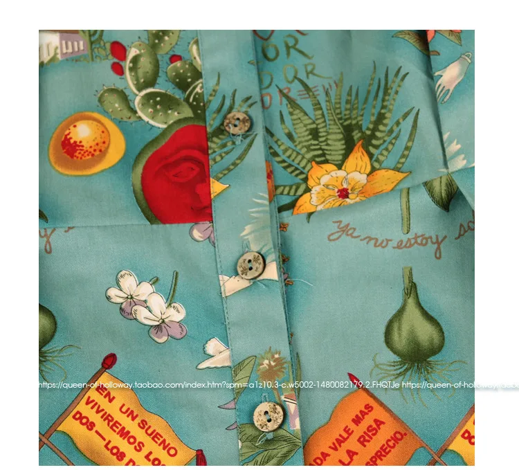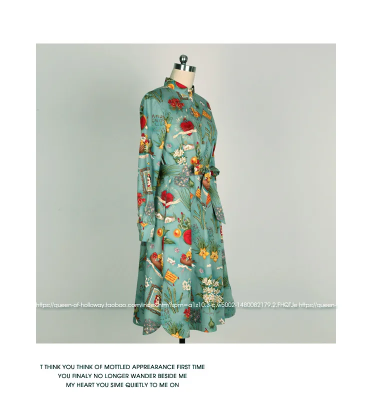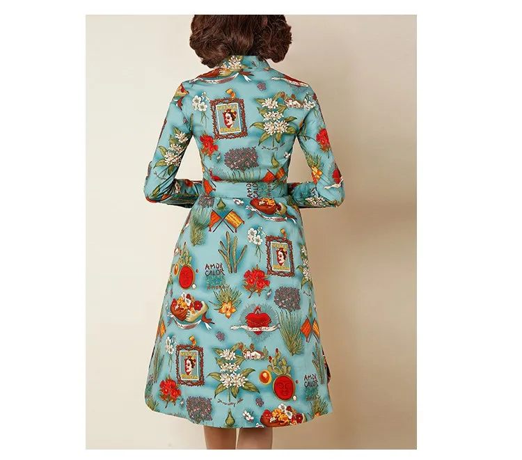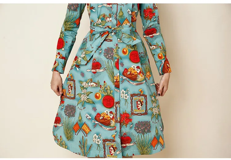 Стильное зеленое женское платье-рубашка с длинными рукавами и принтом F-rida K-ahlo