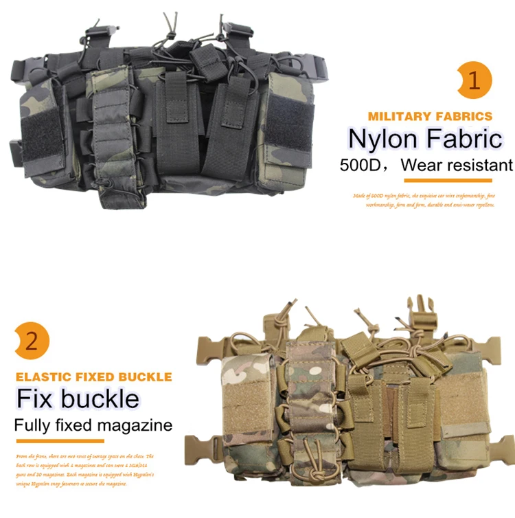 Материал: изготовлен из нейлона 500D, военного материала, прочного материала, не легко сломать, износостойкий и имеет лучшую мягкость. Отлично подходит для занятий спортом на открытом воздухе. Дизайн: грудной клетки имеет характеристики светильник вес, маленький размер, и т. Д. Подходит для случаев без специальным требованиям безопасности, как, например, военных учений.. Верх сумки для журналов-это очень хорошо разработанный фиксированный мешок, который можно легко поместить/извлечь. На задней части груди есть обруч и петля, которые можно установить на все виды пластинчатых носков. Он имеет хорошую совместимость и имеет розетки сбоку для фиксации с другими жилетами. Первый слева-это сумка для журналов с регулируемым размером, которая может использоваться для журналов AK или дымовых дротиков. Второй слева-это сумка для пистолета, которая может держать журнал небольшого размера. Два кармана справа для журналов серии M4/M16.