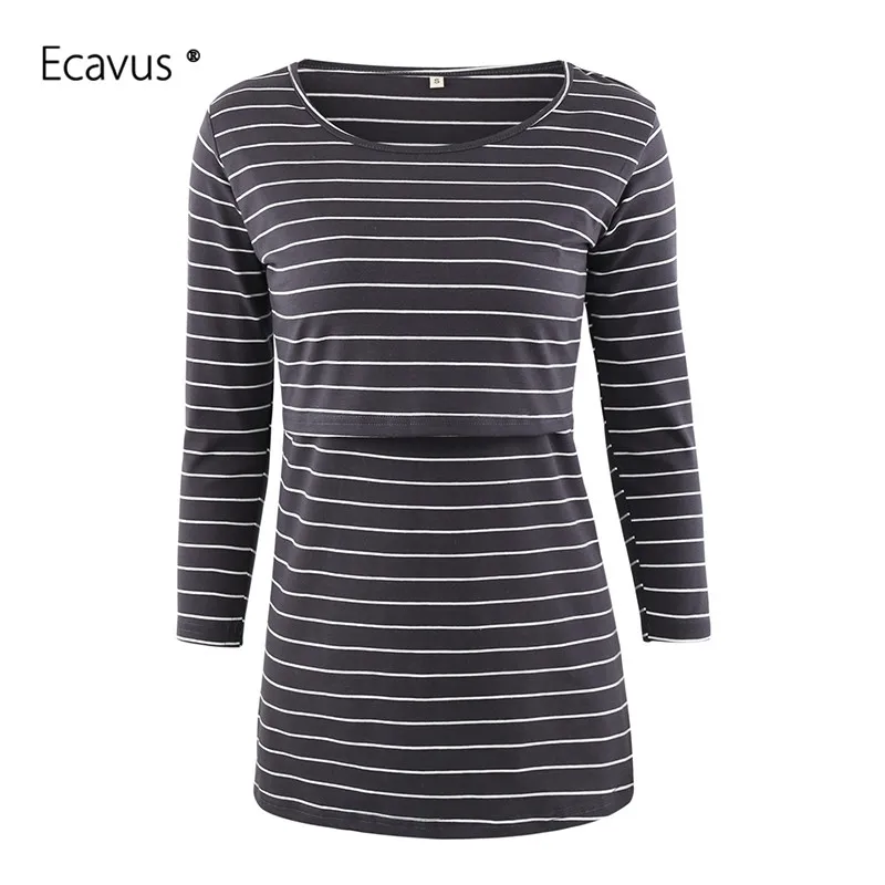 Удобная футболка для кормящих, с круглым вырезом, в полоску, легко одевается с джинсами для беременных или леггинсами для нерабочего стиля.