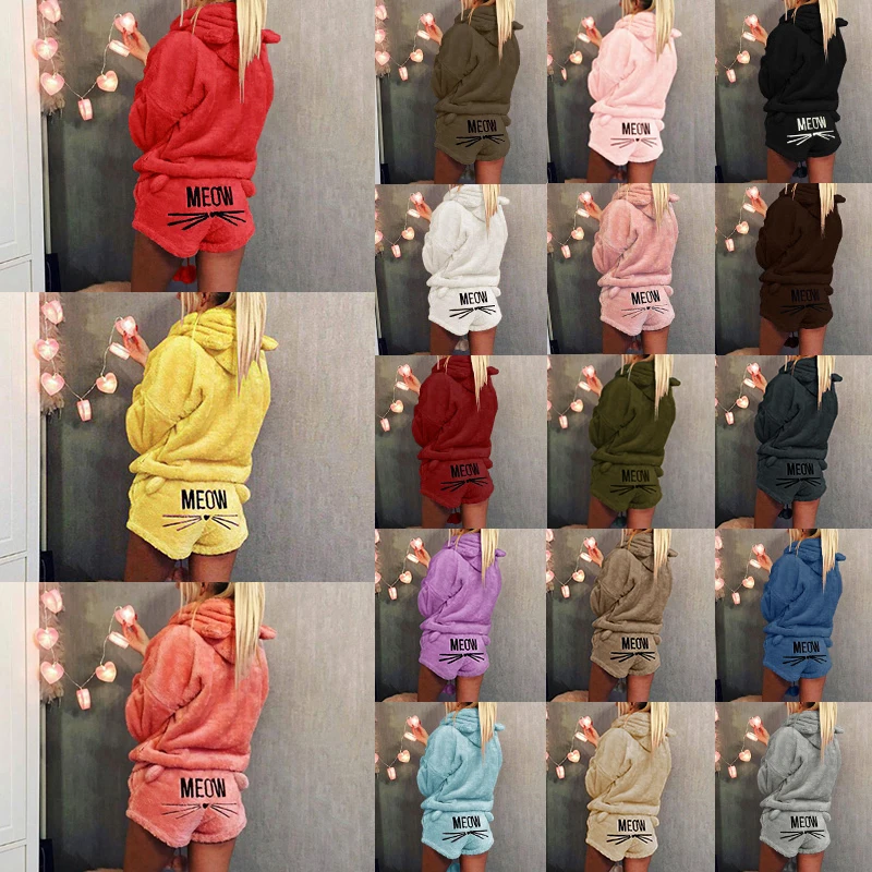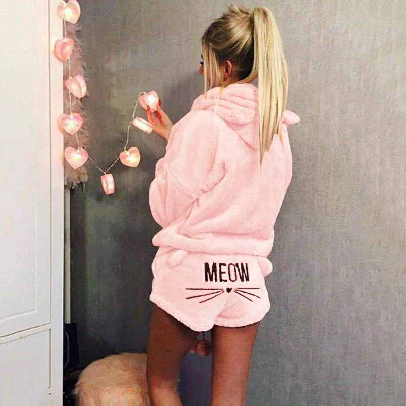 Этот пижамный комплект с капюшоном и шортами-ваш лучший выбор для отдыха дома. Очень удобная Вельветовая ткань кораллового цвета, милый рисунок кота, вырез с капюшоном, опущенное плечо и эластичная резинка на талии. Он отлично согревает вас и делает вас легко шикарным.