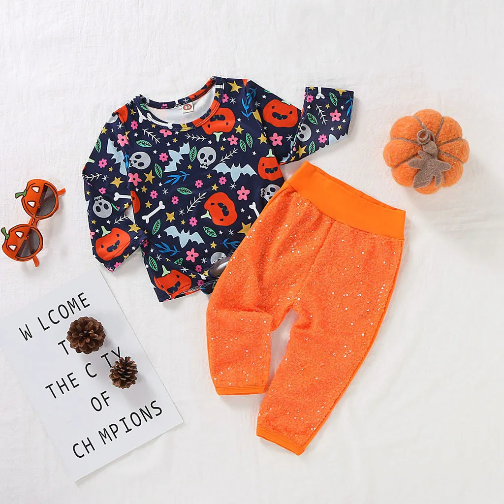 Топы с рисунком тыквы на Хэллоуин для маленьких девочек; комплекты со штанами с блестками
